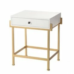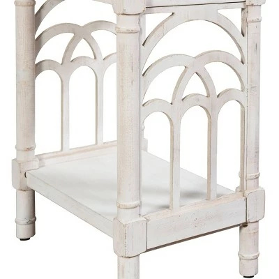 Enjoy a little extra storage and style in your bedroom or living room with this distressed white side table. Featuring a single drawer and bottom shelf with side detailing this piece is perfect to flank a couch or bedside. Constructed from MDF with veneer and fir wood, this side table will bring style to your space for years to come. Regardless if you put it in the bedroom or family room, this side table stands out. This will pair well with farmhouse styling and is sure to be a conversation piece.