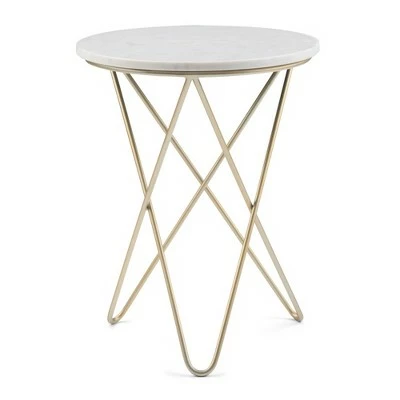 - Hand finished in a gold powder coated finish with white marble top
