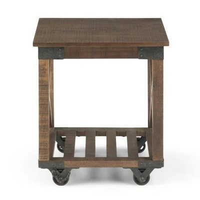 The Barrie End Table pairs the industrial with the rustic to create a distinctive design. Hand-crafted from solid mango wood with iron hardware, this coffee table exemplifies industrial style. Unique iron wheels offer mobility and can be easily locked into place. The open slated bottom shelf offers plenty of storage space and X-side details, bracket corners with rivets round out the design.