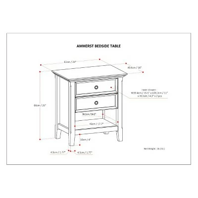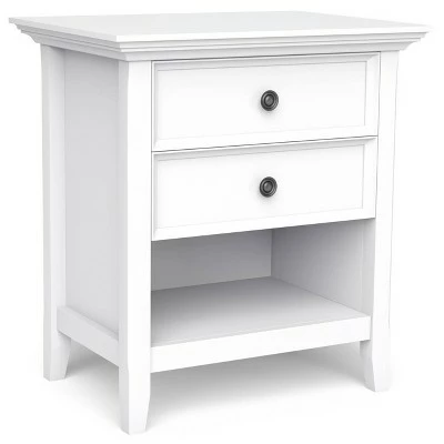 Halifax Solid Wood 24 inch Wide Traditional Bedside Nightstand Table. Can also be used in living or family rooms as end or side tables. Features two (2) spacious drawers and open bottom storage area. Handcrafted with care using the finest quality solid wood. Style includes elegantly tapered legs, molded crown edged table top, panel framed drawer fronts. . Efforts are made to reproduce accurate colors, variations in color may occur due to computer monitor and photography. The product is warranted to be free from defects in material and workmanship for a period of (1) year from the date of purchase to the original owner.