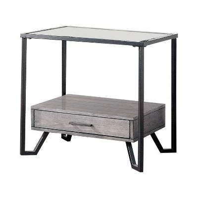 Mingling Industrial and Contemporary Farmhouse design elements, this two-piece accent table set features a mixed material wood and metal construction. The set is highlighted with two-tone gray and black finishes, trending in the current interior design world. Each table is topped with a clear glass tabletop and includes a storage drawer case underneath that appears to float on hairpin metal legs.