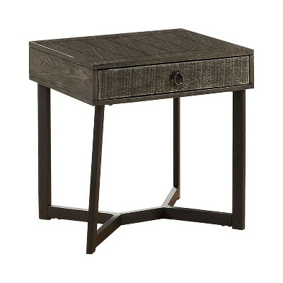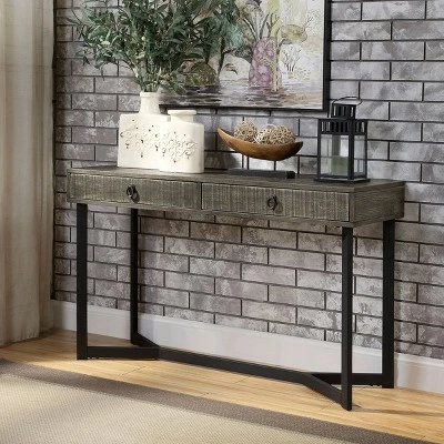 Embrace an Industrial design aesthetic with a Farmhouse touch in this charming three piece accent table set for the living room, including a coffee, console and end table. Featuring Y-style distressed gunmetal bases to provide sturdy support to the wire brushed two toned dark oak finished cabinets. Spacious drawers with matching metal ring pulls deliver eye-catching style and impressive storage.