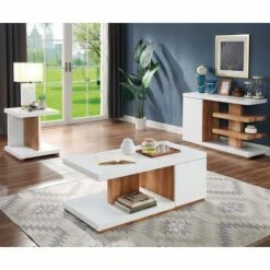 Bring a post-modern design touch to contemporary decor with the appealing minimalism of this three-piece accent table set that includes one coffee table, one end table, and one console table. The set features a cool two-tone wood and crisp white finish with geometric design elements that draw the eye and impart stylish refinement.