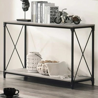 Give your living room or den a combination industrial-rustic appeal with this transitional three-piece living room set featuring coffee table and two end tables. Each piece features a rectangular top in a gray finish with rustic wood grain details, with a metal frame and legs highlighted by an X-cross side design. The tables also come with an open bottom shelf for convenience and rivet details at the corners for rugged style.
