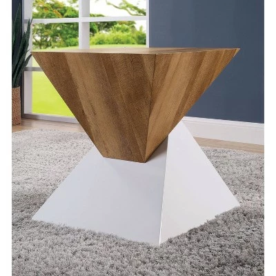 At the edge of contemporary vibes, this three-piece accent table set changes the mood in a modern living space, offering a sleek blend of wood, glass, and steel, and creating a compelling yet versatile aesthetic. A novel base forming two wood triangles with natural and white finishes creates visual impact, with the sofa table and coffee table featuring rectangular tempered glass tops, and a natural wood surface on the end table. Make this dynamic design the center point in an energizing living space.