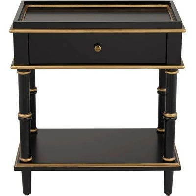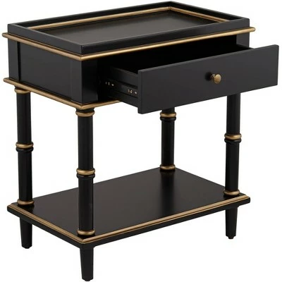- Black finish over rubberwood and MDF construction. Gold trim and drawer handle.