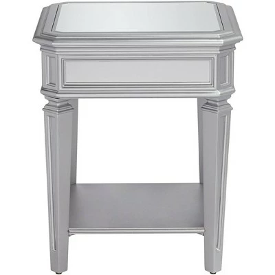 Open up your space with this mirrored side table and see how the light reflects off it. The lower shelf allows for additional storage and the mirrored top highlights whatever you place on top. The rest of the table is covered in a bright silver finish for additional shine.