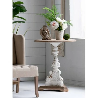 Made with fir wood and displaying a natural wood finish, the Antique White Round Side Table is a unique spin on the traditional round table. The carved pedestal base features a classic, elegant flowers with exciting detail. Perfect for placement in a living room, bedroom, or even a dining area, this piece exudes a classic vintage style that will complement many decor styles! This item belongs to a collection of items created and designed by A & B Home, Inc., a family owned business founded in 1993. A & B Home Inc. is recognized as an international leader specializing in quality products with innovative design for the home decor, furniture, garden, and seasonal product categories.
