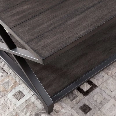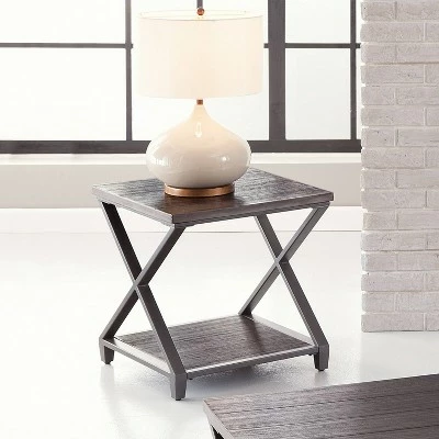 Step up your look with the sophisticated, rustic Alex End Table. The table is scaled perfectly for your living area and complements many different upholstery styles. The wire-brushed, plank-effect top and bottom shelves with double “x” Â metal side supports frame this striking piece. Your purchase includes one end table. Cocktail table also available for purchase separately.