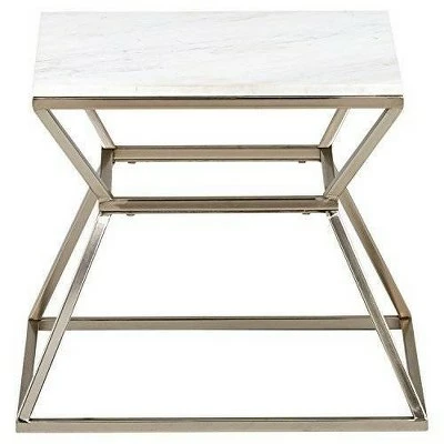 - Square marble print top and geometric metal base combine for a sleek modern look
