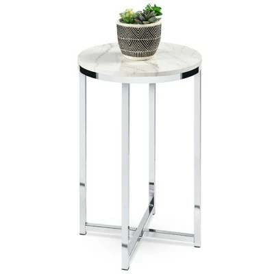 Stylish yet subtle home furniture is essential to the space-saving interior decorator This accent table is carefully crafted with a round, marble tabletop over a bronze-finished metal frame to add elegant charm to any space. The solid metal frame and balanced table top help keep this table sturdy and support a 55lb weight capacity. Aside from the sturdy frame, this piece has a 16in. diameter table top! The table’s smooth frame and faux-marble surface make for an easy-to-clean table that can be wiped in seconds. Finally, protective plastic feet (foot sliders) help prevent the table from scratching your floors. If you need a tasteful, compact, and scratch-resistant table, then look no further!