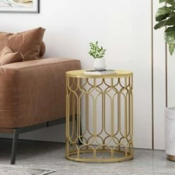 MODERN GLAM: Our side table showcases a simple yet beautiful geometric design and a dazzling metallic finish that pair seamlessly with subtle curves for a luxurious modern glam look. Completed with a stunning tempered glass top, this table brings a sleek touch to any decor.