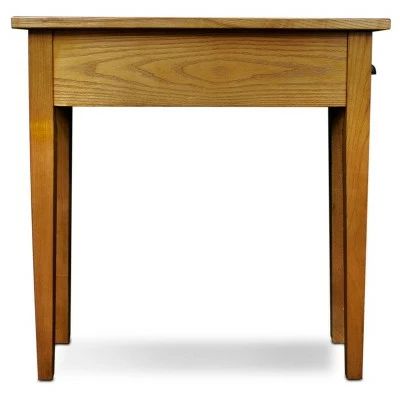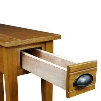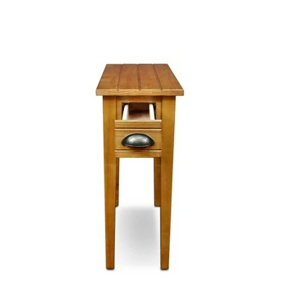 The relaxed simplicity of the cottage lifestyle is captured in this narrow side table with blackened bin pull metal ware. Any chair becomes a better place to sit with this tables planked solid wood top within easy reach. Finished in a warm Candleglow, this end table will add a natural look next to a sofa or recliners.
