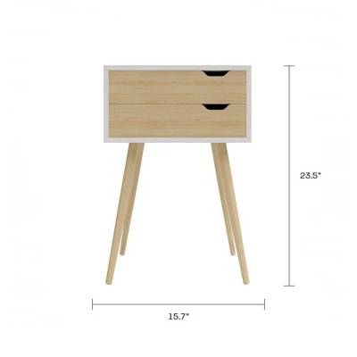 Clean line in design and mid-century in aesthetic, the Blythe 2-Drawer Side Table just might be the piece to add the finishing touch to the room. Compact and modest, the streamlined design echoes retro with a modern twist, with two natural wood finish drawers that feature a hip slotted drawer pull design. Great as a bedside table or end table by the sofa, this is sure to keep items out of view while doing double duty as a table. Two USB ports are built right into the tabletop for your convenience. The glossy, scratch-resistant paint finish of the table is complemented by the natural wood dowel legs, keeping a true retro yet urban feel. This lightweight yet durable table is easy to move around and easy to clean.
