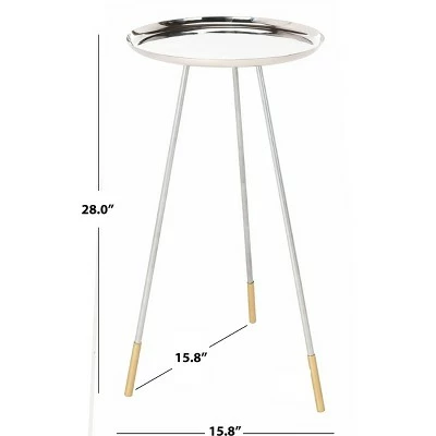 Inspired by the iconic style of Old HollywoodÕs screen sirens, this chic contemporary side table was designed for the modern diva. Its polished silver finished top and tripod legs feature rich gold detail that creates instant drama in any living room. Care Instructions: Dust regularly with a soft, dry cloth. Never use oiled or treated cloths on lacquered finishes. Some finishes can be wiped with a damp (not wet) cloth, followed at once by rubbing with a dry cloth to remove fingerprints and smudges. For persistent spots, gently clean with a soft cloth and a solution of water and mild soap, make sure to wipe dry. Use adhesive felt pads, coasters and placemats to protect your furniture.