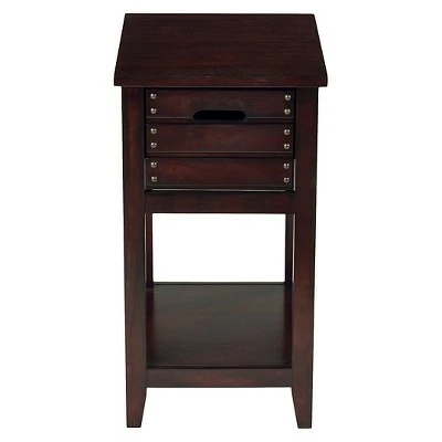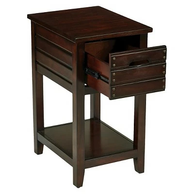 Enjoy the sophisticated charm that an OSP Designs, Camille Chair Side Table with Walnut Finish has to offer. This stunning end table has a slim design to easily slip beside your chair or couch while offering just the right amount of surface space to place your drink, remote or cell phone. The handy drawer and fixed shelf offer additional storage space. The built-in handle makes opening and closing the drawer a breeze while the wood construction enhances durability and stability. The rich walnut finish and classic nailhead accents make it a great match with contemporary or traditional dĂ©cor. End tables are a quick and easy way to add an extra touch of functional style to your living room, family room or office. Dimensions: 25.75″ H x 14″ W x 18″ D.