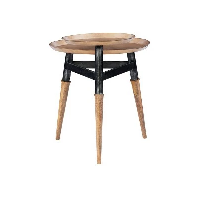 Versatile two-tier side table adds elegant artsy element to the living room, bedroom or den. Functions as a nightstand for slumber time, alarm clock, and charging station or as an end table finished with lamps, plants, or curios next to the sofa. Twin iron plateaus roomy enough for makeshift home office or to repurpose as party buffet in a snap. Mango wood tripod leg design affords sturdy support up to 50 lbs. Two tone hue adds warmth to living space. Comes fully assembled.