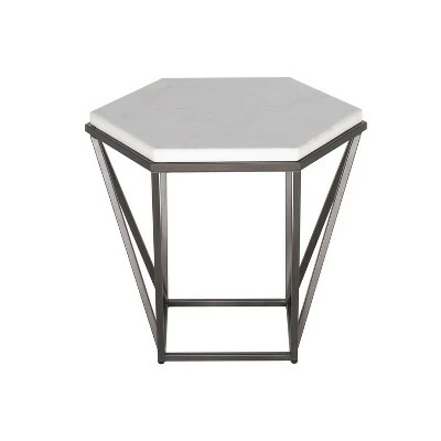 A stunning end table with white marble and hexagon shaped base, the Corvus represents modern elegance for today’s living room. architectural shaped base is a durable powder-coated metal that resists scratching and rusting. The gorgeous white marble top pops next to the coffee colored base. Your purchase includes one end table.