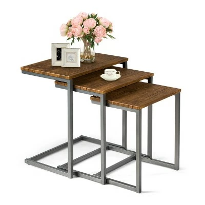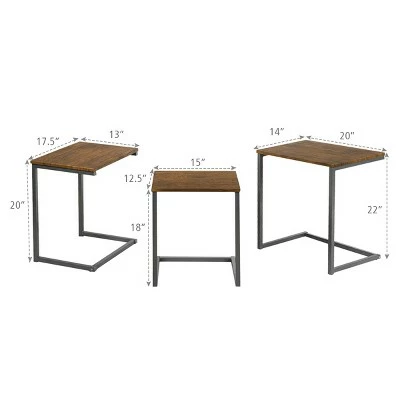 This is our new 3-piece multifunctional coffee tables. Our sofa side tables are in C-shape, making it possible to have everything close to you. These cleverly designed tables can be neatly put under your couch or bed. Moreover, three tables can be stacked together to save storage space, and you can conveniently separate them around the room when guests come over and then stack them to save space when guests leave. The wooden table top and steel tube structure make the table strong and durable, greatly prolonging its service life. Besides, the lightweight and portable design allows you to move it easily. With our detailed instruction and pre-punched holes on these tables, you have no trouble assembling it. Add these handy side tables to your living room, bedroom, and workshop.. Specification: Color: As the picture shows. Material: MDF, steel pipe. Overall Dimension (Large): 20” X 14” X 22” (L×W×H) . Overall Dimension (Medium): 17.5” X 13” X 20” (L×W×H) . Overall Dimension (Small): 15” X 12.5” X 18” (L×W×H) . Net Weight: 18.5lbs. Weight Capacity of Each Table: 33lbs. Package includes:. 3X Coffee table. 1X Instruction.