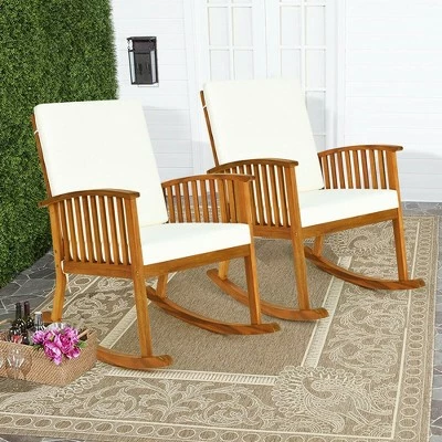 Rock slowly and have a cup of red wine, there’s nothing better than that moment. Forget fatigue of working days and make your whole body relaxed with this rocking chair set. Made of premium solid wood, the frame of the set is sturdy and will serve you for long time. Comes with a round table, it is convenient to place and take snacks and drinks. The backrest of rocking chair is slightly sloping to ensure the most comfortable sitting experience. Equipped with seat and back cushions, the rocking chair will provide long-lasting soft feelings. Plus, the cover of cushion can be removed with zipper for easy cleaning. With rustic and modern style, the chairs and table are perfect to be placed in outdoor or indoor. Specification: Color: Teak. Materials of Chair: Acacia Wood, Fabric, Sponge. Materials of Table: Eucalyptus Wood. Chair Size: 35.5”L x 25”W x 37”H. Table Size: 27.5”L x 27.5”W x 30”H. Load Capacity of Chair: 360 lbs. Load Capacity of Table: 110 lbs. Package include:. 2 x Rocking Chair. 1 x Round Table. 4 x Cushion. 1 x Instructions.