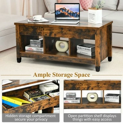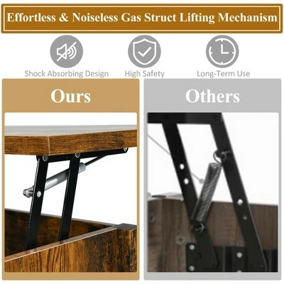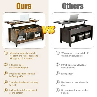 Our interactive lift top white coffee table combines fun and practicability for people. Featuring an adjustable height surface which provides the perfect height for you when you work or drink a cup of coffee, and the hidden storage underneath the table top and the storage space below the table top that make this lovely piece functional as well, it is worth having!. Specification: Color: Coffee. Material: Chipboard+solid wood+metal piece. Overall dimensions: 41”L x 19.5”W x 19”-24.5”H .