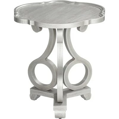 A charming addition to a classic sitting area, this scalloped side table is a wonderful choice. This table is adorned with three curvy legs that are sure to enchant. A brushed silver finish enhances a traditional look, while making it versatile enough for the contemporary home.