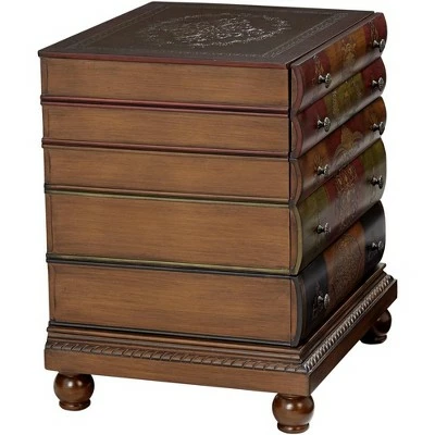 - Distinctive end table with the look of a stack of antique books. Embossed book details.