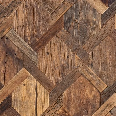 - Inlaid reclaimed wood panels create a unique patchwork design