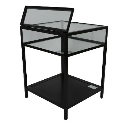 Modern and sleek, this side table offers a unique way to showcase your favorite art or collectibles. The tempered glass tabletop gives way to transparent storage via a hinged door at the front. Matte black metal serves as the table’s frame for classic industrial influence and includes a solid lower shelf for storage versatility.