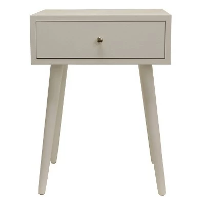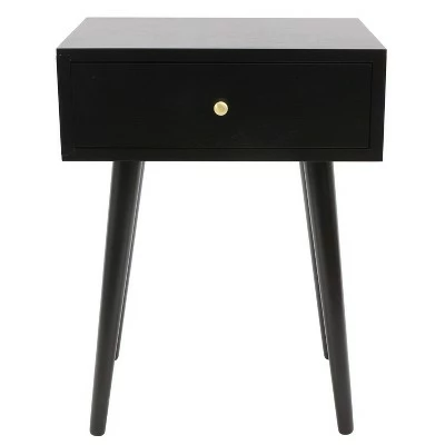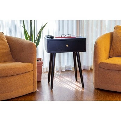 If you are looking for an affordable way to modernize your home with mid-century flair, look no further, this side table storage accent table will fill the bill! This uniquely designed side table encompasses mid-century modern design by exuding clean lines, a stylish finish, and simple round hardware. Features include hardwood solids and veneer construction, one storage drawer, and tapered legs. This product is extremely versatile and can be utilized as a side table, or accent table. Size: 17.75w 13.75d 23.5h Manufactured in China. Ships Small Parcel. Assembly Required.