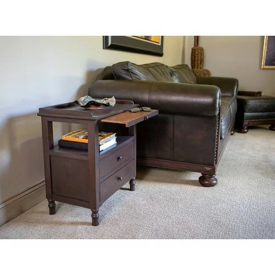 Instantly pull your living room ensemble together with the effortless sophistication and functionality of the Timothy Side Table. This timeless end table blends clean, modern lines with traditional elements, including turned legs, to create a transitional look compliments an array of home furnishings and styles. Two storage drawers allow you to keep clutter out of sight, store a throw or house books. Place a basket or artful home accent on the open shelf to maximize your storage opportunities. A small tray pulls out to reveal additional storage, ideal for penning a note or holding a your favorite beverage while you sit and relax. The Timothy side table is stately, yet compact, making it ideal for smaller living spaces as well as larger ones. Place this transitional side table next to a sofa or arm chair to bring warmth, organization and style to your family room bedroom. Constructed of Assorted Solid Wood, MDF and Veneer. Measures 22x14x24″