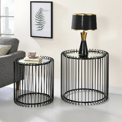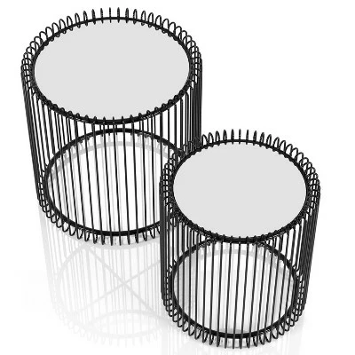 Crafted with bold, artful style this set of two nesting tables delivers interesting texture and dimension. Each table is round with a mirrored tabletop that calls attention to the base design. Its cage style boasts U-shaped outward curves at the top and bottom of each individual support. Offering sculptural flair in any living space, this nesting table set is a stylish and versatile addition to your compact living space.