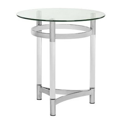 This round glass end table is an aesthetic pairing of iconic Bauhaus style and decadent vintage Italian design. A modern heirloom for any living room, itβs crafted with smooth glass and sleek acrylic. Designers love its polished stainless steel finish. The cool mod design and bright elegant details of this end table makes it a perfect addition for contemporary, modern, or transitional rooms. Its clear glass top makes it perfect for a vase full of flowers or a stack of books.