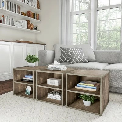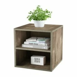 Bring the best of style and function to your home with the Modular Cube Side Table with Double Shelves by Hastings Home. The modern, clean lines and chic, updated style bring casual elegance to your home. The table is constructed from sturdy manufactured wood that supports a 22-pound weight capacity on each shelf as well as the table top. It can be used freestanding on its own, side by side with another to create a coffee table or with bracing kits to stack for vertical shelving. The end table can be assembled easily with the included hardware and convenient, pre-drilled holes on each piece of the unit. The open front and two fixed 7-inch high shelves are great for displaying and organizing a variety of items like books, magazines, collectibles and even vinyl records! The rustic wood grain look of this side table is sure to enhance your living space decor.
