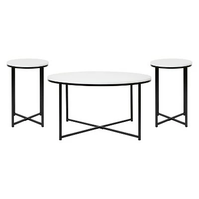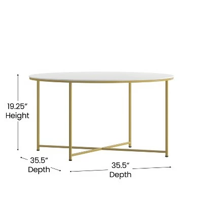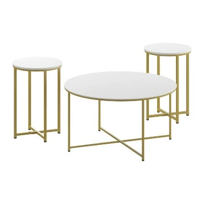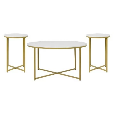 Update the atmosphere in your home with the sophisticated, polished look of this 3 piece mixed media coffee table set. Featuring white engineered wood tops, this occasional table set blends seamlessly in any space. The round shape atop modern crisscross brushed gold metal legs completes the overall look of these stunning pieces. Whether you’re serving coffee, tea, or just want a place for decorative items, you will never have to worry about the safety of these tables. The strong .5 inch thick engineered wood top stands up to daily use while the sturdy cross brace metal frames keep your possessions secure. A durable powder coated finish ensures this living room table set will look great for years to come. Have your new tables ready to use in under 30 minutes with the included step-by-step instructions and included tools. Floor glides will protect your hard flooring surfaces from scuffs and scrape and messes clean up quickly and easily with a water based cleaner. Additional Features: Cleans Easily with a Water Based Cleaner, Assembles in 30 Minutes or less for quick use, Occasional table ideal for any room in the home.