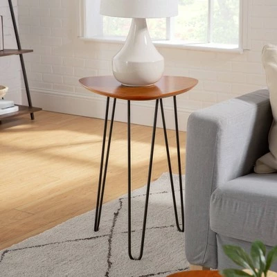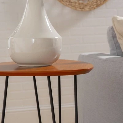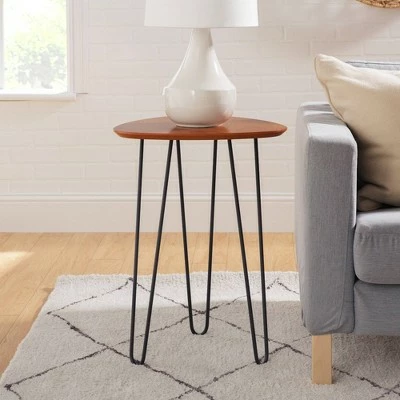 Tumble back in time with the groovy, Mid-Century Modern Side Walnut Table by Saracina Home. Sleek Hairpin legs, a warp-resistant veneer, and guitar-pick tabletop make for a strong, retro shape. Evoke sophistication with this trendy piece and watch your style elevate. Dress up the table with your favorite home décor or let it speak for itself as a chic statement piece. Want more than one? Consider Saracina Home’s nested table set for two of these vintage inspired beauties.