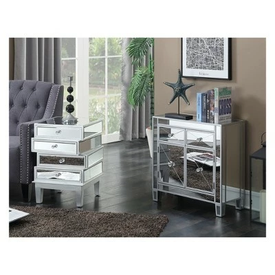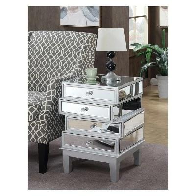 Bring a touch of elegance and glam to your home with the Gold Coast J Daniels End Table by Breighton Home. Featuring 4 asymmetrical drawers that allow plenty of space to hide away unsightly accessories remote controls or magazines. Mirrored glass panels paired with faux crystal rosette drawer knobs really pull this piece together. The staggered effect of the drawers gives this piece a unique yet classy contemporary design. Look for other items from the Gold Coast Collection from Breighton Home.