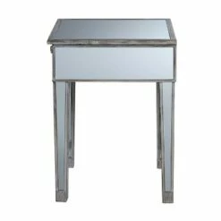 The classy yet contemporary styling of the Gold Coast Mirrored End Table with Drawer will bring new life to any space. The glass mirror inlay pairs perfectly with the fir wood base. The faux crystal drawer pulls bring the look together giving you access to the drawer providing concealed storage. Look for other pieces from the Gold Coast Collection sold separately.