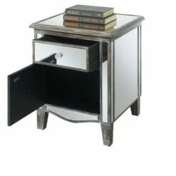 Make an elegant statement in your home with the Gold Coast Park Lane Mirrored End Table by Breighton Home. This multifunctional piece will brighten up your living room, home office or den with its beautiful mirror finish. Featuring a glam style, this accent unit will refresh any home decor instantly. Crafted from MDF, fir wood, non lead based paint and mirror, this side table is built for longevity and easy maintenance. Featuring a pull out drawer and cabinet to optimize your storage space for all your essentials while keeping them easily accessible. The chic faux crystal rosette knobs add to its unique luxurious design. Elegantly display your favorite lamp or mementos with its mirrored finished tabletop. Enjoy this accent piece in no time with its fast and easy 3 step assembly. Available in multiple finishes to complement any home decor. Look for additional pieces from the Gold Coast Collection by Breighton Home. Each sold separately.