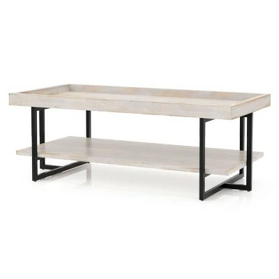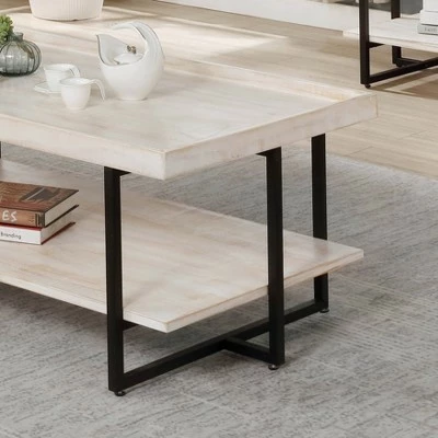 Perfect for a spacious living room, this 2-piece table set features an elegant and contrasting 2-tone finish. Featuring a coffee table and end table, each furniture piece rests on a minimal trestle-like metal base in a black finish. Resting on each base is a tray-like tabletop with raised edges and an open lower shelf in an antique white finish that lends a country vibe that works wonderfully with a transitional style home.