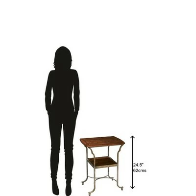 - Decorative antique brass metal base with metal perimeter around a veneered shelf.