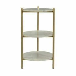 Three tiers of polished White Marble are held aloft on thin metal legs finished in a rich gold powder coating on this delightful Accent Table. The perfect size for that little nook in your kitchen, or to hold a couple candles and small baskets of soaps and lotions in your guest bath. And for your plants in that sunny spot, just perfect!