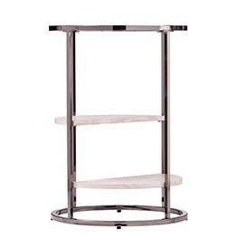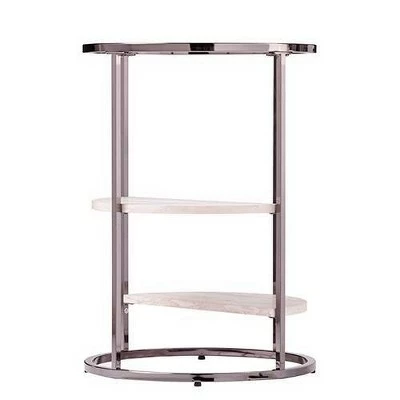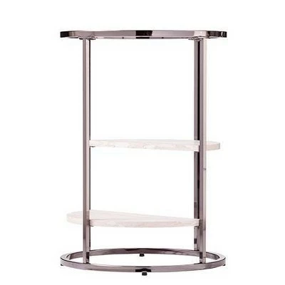 Find your better style half with the Aiden Lane Lademore Round Side Table w/ Faux Stone. Faux travertine half shelves climb up the open frame, creating unique ledges for décor or trinkets. A round glass tabletop caps off a play on negative space, while the neutral color scheme blends in with your contemporary design. Round up TV remotes and your morning coffee mug when you slide this modern side table next to your living room sofa, or put potted succulents and terrariums on display with this end table in your entryway or open concept space.