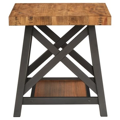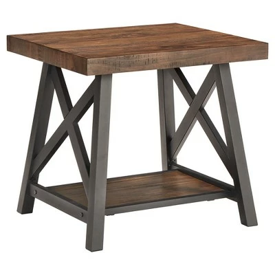 Bring a look of eye-catching contrast to your living space or home office with the Lanshire Rustic Industrial Metal and Wood End Table from Inspire Q. This industrial-style table features two metal X-base sides that contrast with the warm wood-finished tabletop and storage shelf below. Add a lamp on top and a stack of books or magazines on the bottom to complete a cozy reading spot