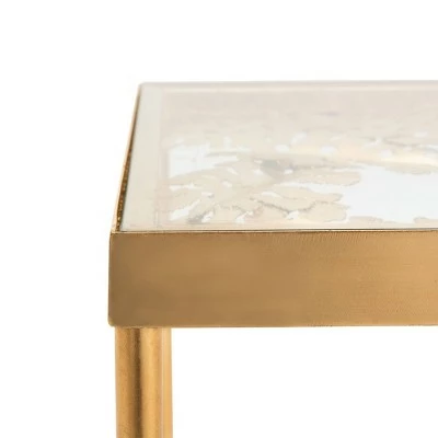 Inspired by the work of master artisans, this glamorous palm leaf side table brings instant savoir-faire to the living room. Finely crafted, its intricately sculpted palm designs are displayed beneath glass to highlight its timeless artistic style. The gold color adds to its a relaxing and lux design and exemplifies its stunning gold leaf finish. The clear glass top makes for a solid base for accessories such as lamps, books, and other belongings to be set upon. A truly lovely add to the living room.