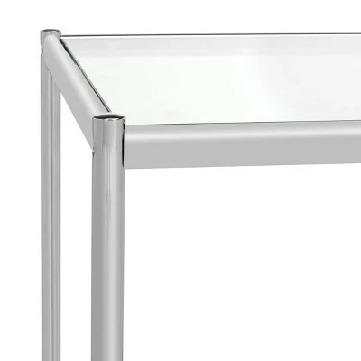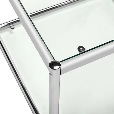 Designed for the educated palate, this contemporary glass end table has all the right angles. The modern chrome finish of the Lilias Glass End Table is paired with smooth plate glass, offering up ample space to display treasures or the requisite glass of wine. Its clean and open structure makes it an easy favorite of architects. The Llias Glass End Table is made with glass and iron tube, required assembly, and holds up to 15 pounds.