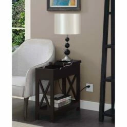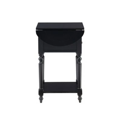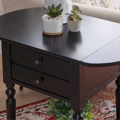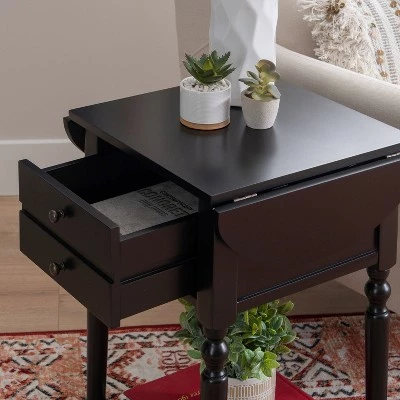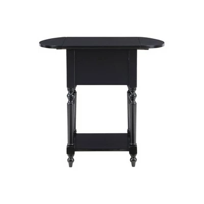 The Marco Dropleaf Table has it all – style, color, and function – to make it the perfect accent for any room in your home. The square table takes up minimal floor space but offers the added bonus of having a rounded dropleaf extension on each side that can easily be raised when you need more space. The double wooden supports of the dropleaf extensions make it a sturdy surface for daily use. A deep single drawer for storage has a faux double drawer detail and oil rubbed bronze knobs. A sleek finish, turned legs, and a bottom shelf complete the look.