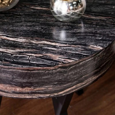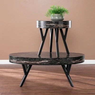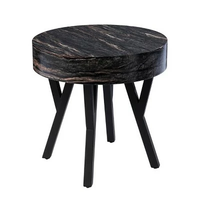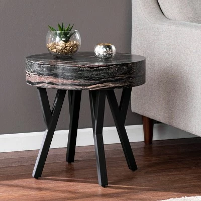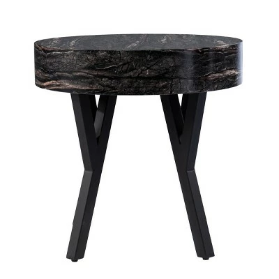 Refresh your modern design with the Aiden Lane Masnan Round Faux Marble End Table. The black faux marble design keeps your living space feeling sleek and contemporary, while iron legs add a hint of industrial flair. A round tabletop elegantly holds your favorite décor or a potted plant, sliding neatly alongside your sofa or into your small space entryway. Take your modern décor up a notch when you bring home this round accent table.