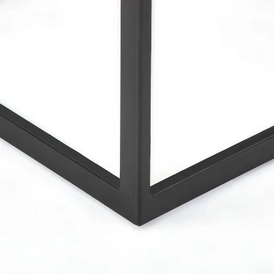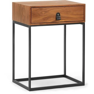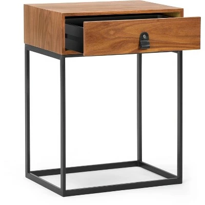 This side table has a small footprint and features a storage drawer with a black leather handle. Taking its design cues from the mid-century modern movement, this accent table has a simple square silhouette and a minimal design with casual sophistication. The black frame on this table is complemented nicely by the warm wood tone and these neutral colors allow for easy placement in rooms of any color.