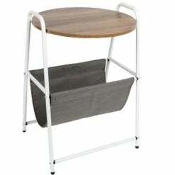 Clean up clutter with the fabric storage pocket on this Mind Reader round end table.Help keep your side table and small spaces clear from clutter with the additional storage pocket on this stylish end table from Mind Reader Products. Too often, it’s easy to let newspapers, books, unopened mail, and other accessories pile up on flat surfaces like coffee tables, end tables, or credenzas. The convenient fabric pocket on this end table provides a tidy way to stash those unsightly accessories out of the way but still within reach, while handles on either side make it extra easy to relocate the table wherever you need it.The sturdy steel and particle board construction offers strong, reliable support for the tabletop and fabric pocket, and won’t bend or warp over time. Rubberized feet protect hardwood floors from scratches while also making sure the table stays in place during use. The straightforward assembly process can be completed in minutes, and the stylish design makes a clean accent to any room where you decide to set the table up. The rustic round design occupies a smaller profile than rectangular tables, making it ideal for use in smaller rooms, like dormitories or studio apartments. Spruce up your living space with a rustic end table from Mind Reader Products that features additional storage space. The overall dimensions are 17.5 L x 18 W x 26.25 H. The storage pockets are 10.75 L x 16 W x 9 D and made from a powder-coating steel.